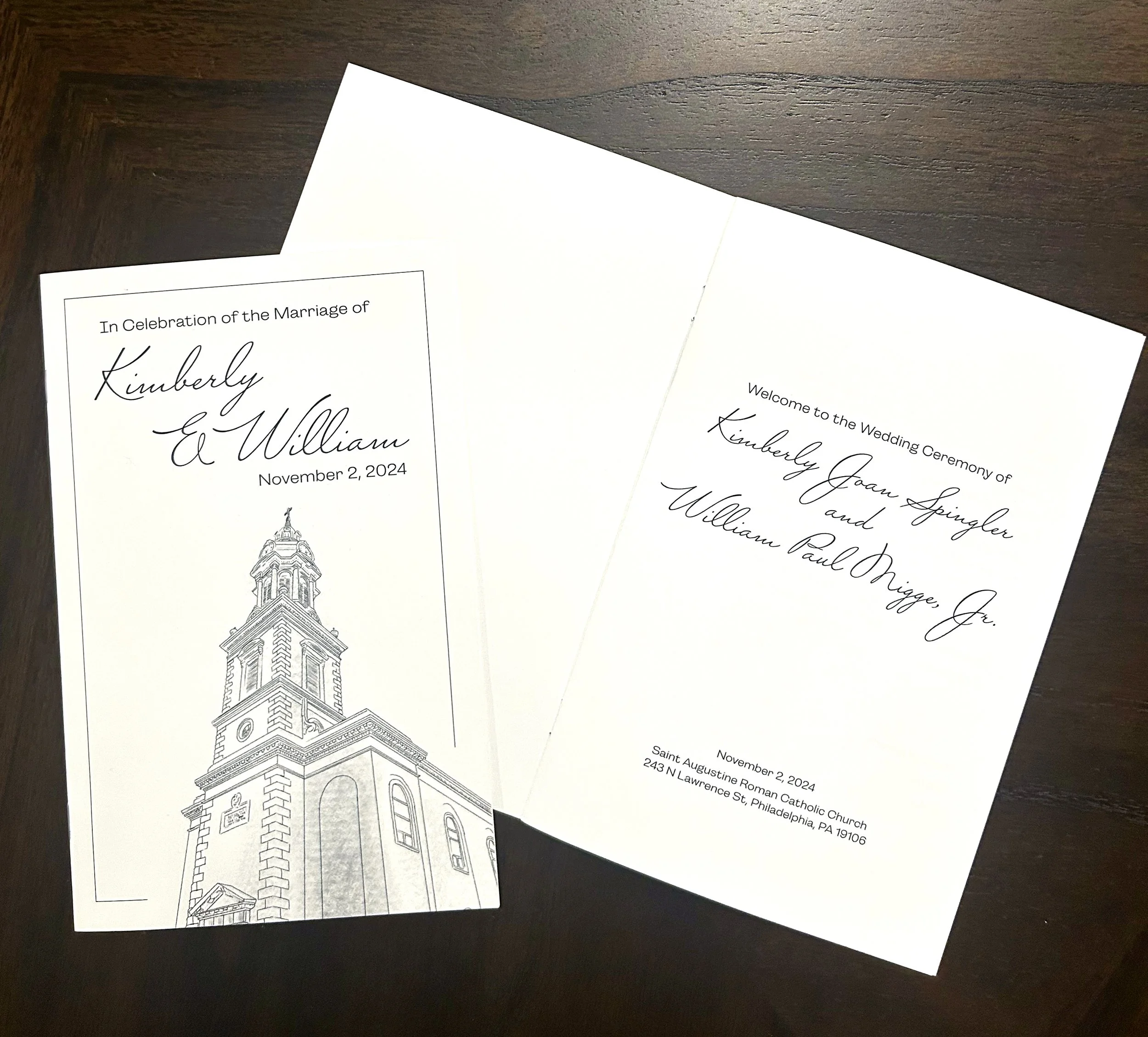 The logo can be found throughout the invitation suite as a way to tie everything together. The invitations feature gold foil and are wrapped together with velvet ribbon and a gold wax seal. Since the reception took place right on Broad St, with a great view of City Hall, I was inspired to create a custom illustration for the back of the main invitation. I wanted to continue this theme throughout, so I also created a custom illustration of St. Augustine Roman Catholic Church for the ceremony booklet.
